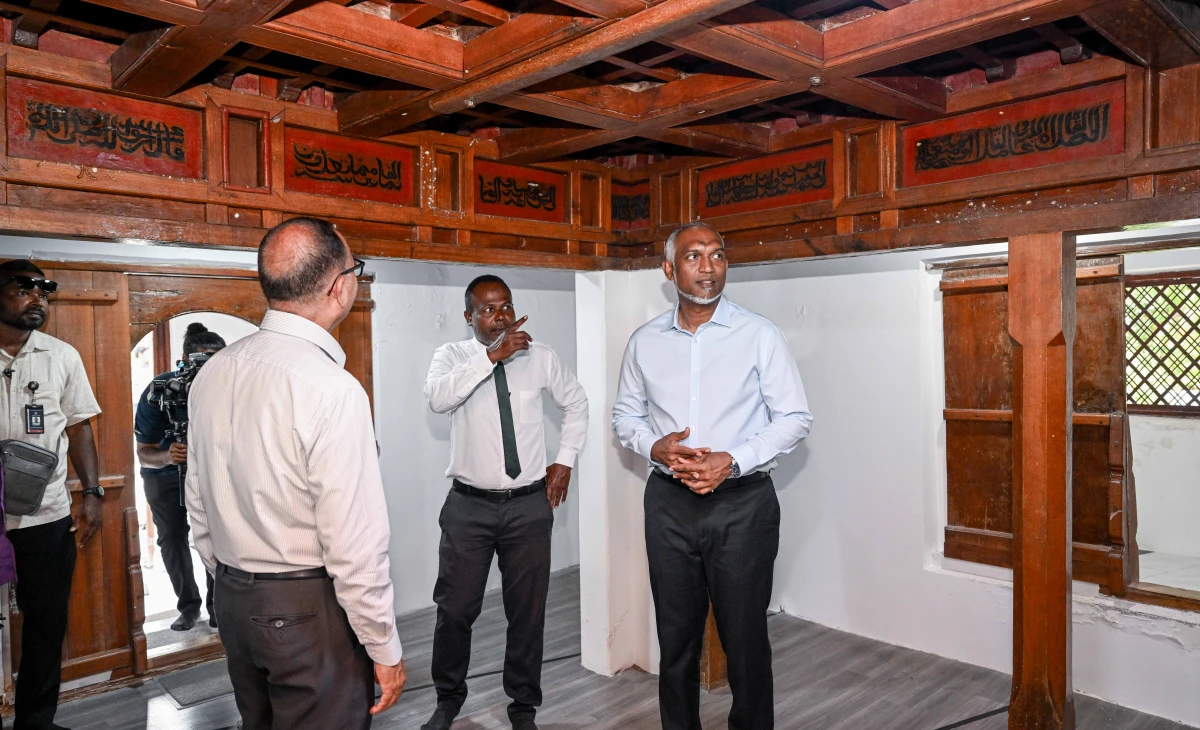 President Dr Mohamed Muizzu paid a visit to the centuries-old Ghaazee Mosque on Meemu Kolhufushi during his tour of the atoll, taking time to examine the mosque’s condition and discuss ongoing preservation needs.